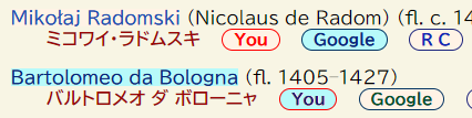 - 主に、1300年以降の作曲家 4958名を時代順に列挙して、(作曲家名で検索)。全ての作曲家に英語版 Wikipedia へのリンクあり。