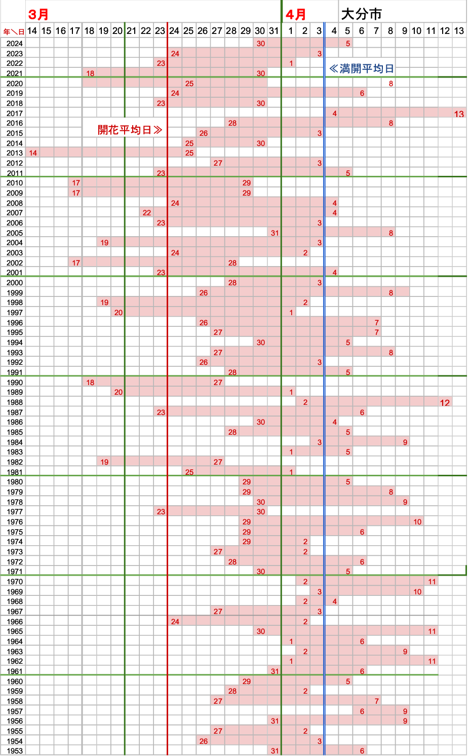福岡県の桜の開花と満開日 1953~2024年