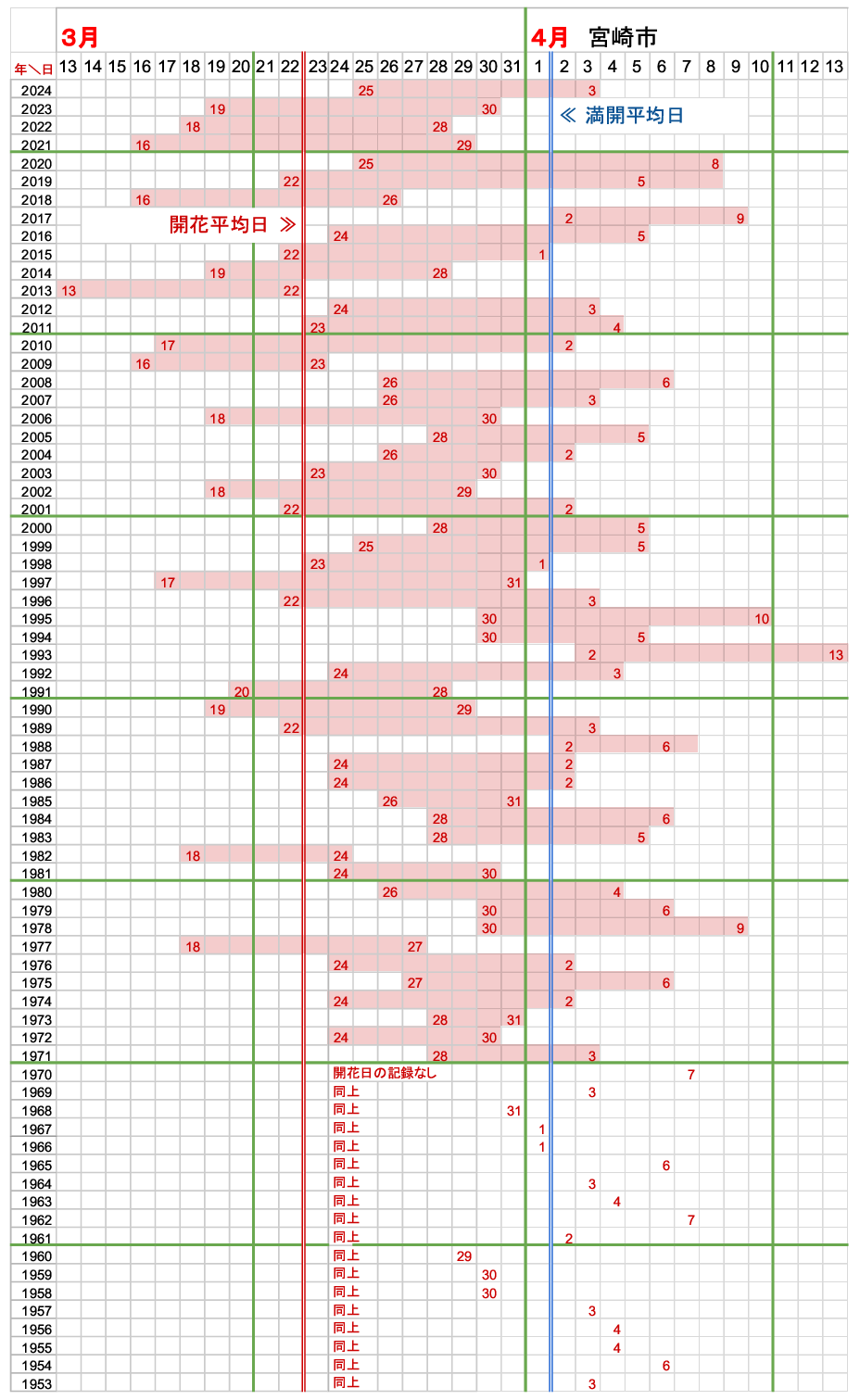 - 気象庁のHP さくらの開花日 さくらの満開日 による 1953~2024年のデータ