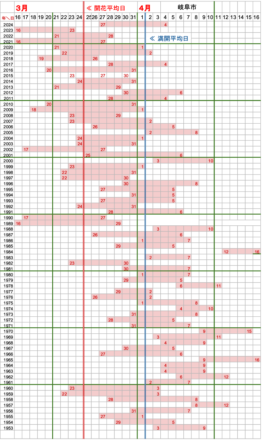 - 気象庁のHP さくらの開花日 さくらの満開日 による 1953~2024年のデータ
