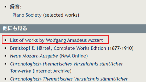 上記ページの 「他にも見る」欄から List of works by Wolfgang Amadeus Mozart でケッヘル番号で探すことも出来る。