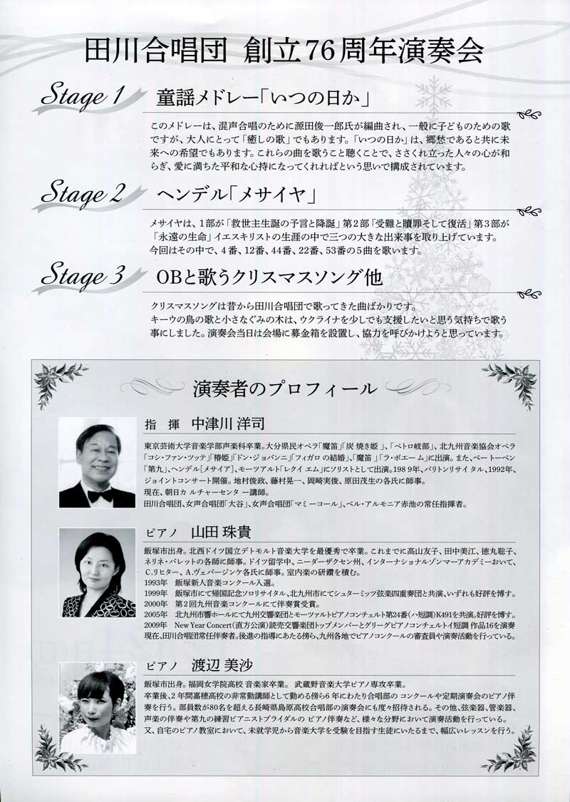 2009年 New Year Concert(直方講演)読売交響楽団トップメンバーとグリーグピアノコンツェルトイ短調 作品16を演奏。現在、田川合唱団常任伴奏者、後進の指導にあたる傍ら、九州各地でピアノコンクールの審査員や演奏活動を行っている。