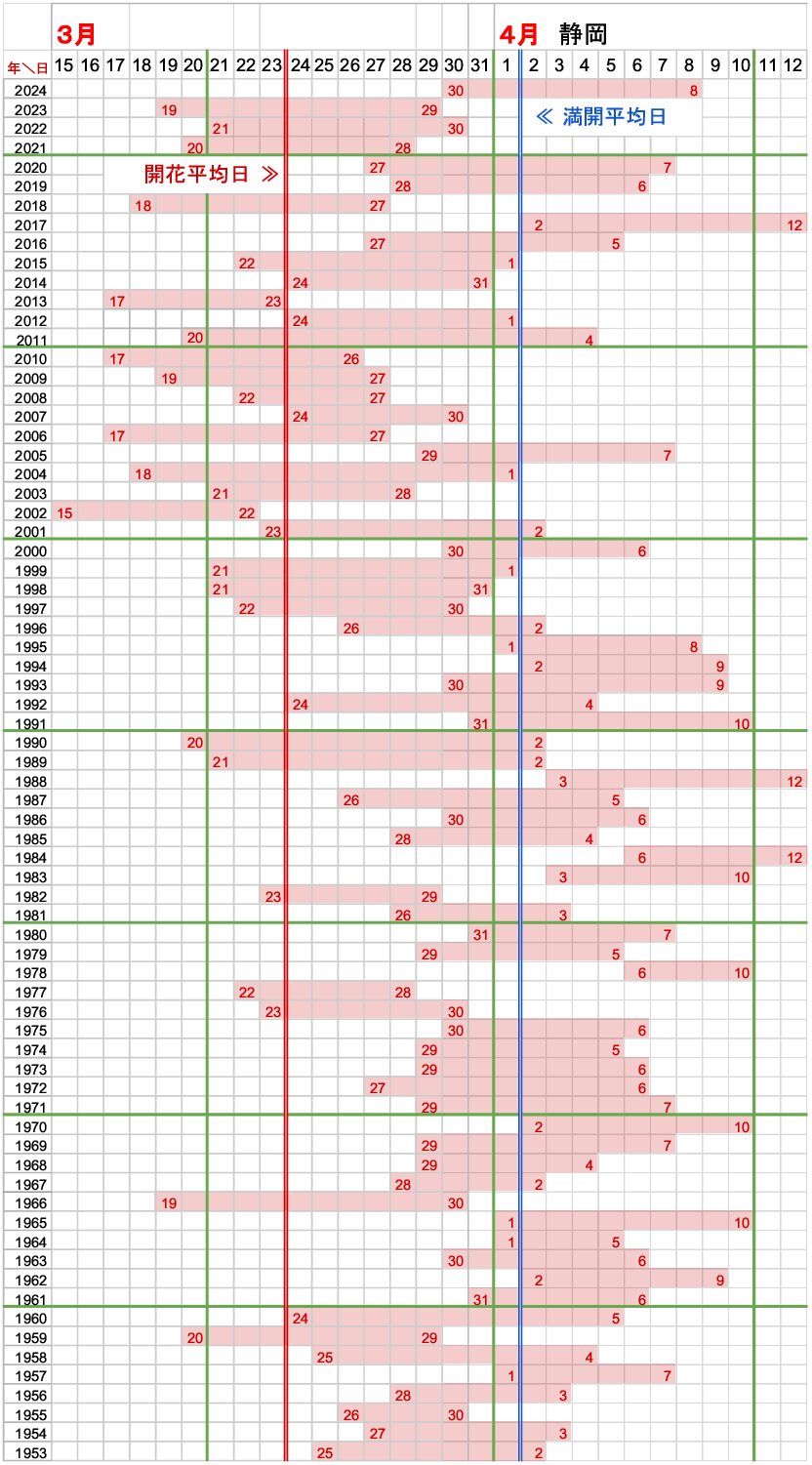 - 気象庁のHP さくらの開花日 さくらの満開日 による 1953~2024年のデータ